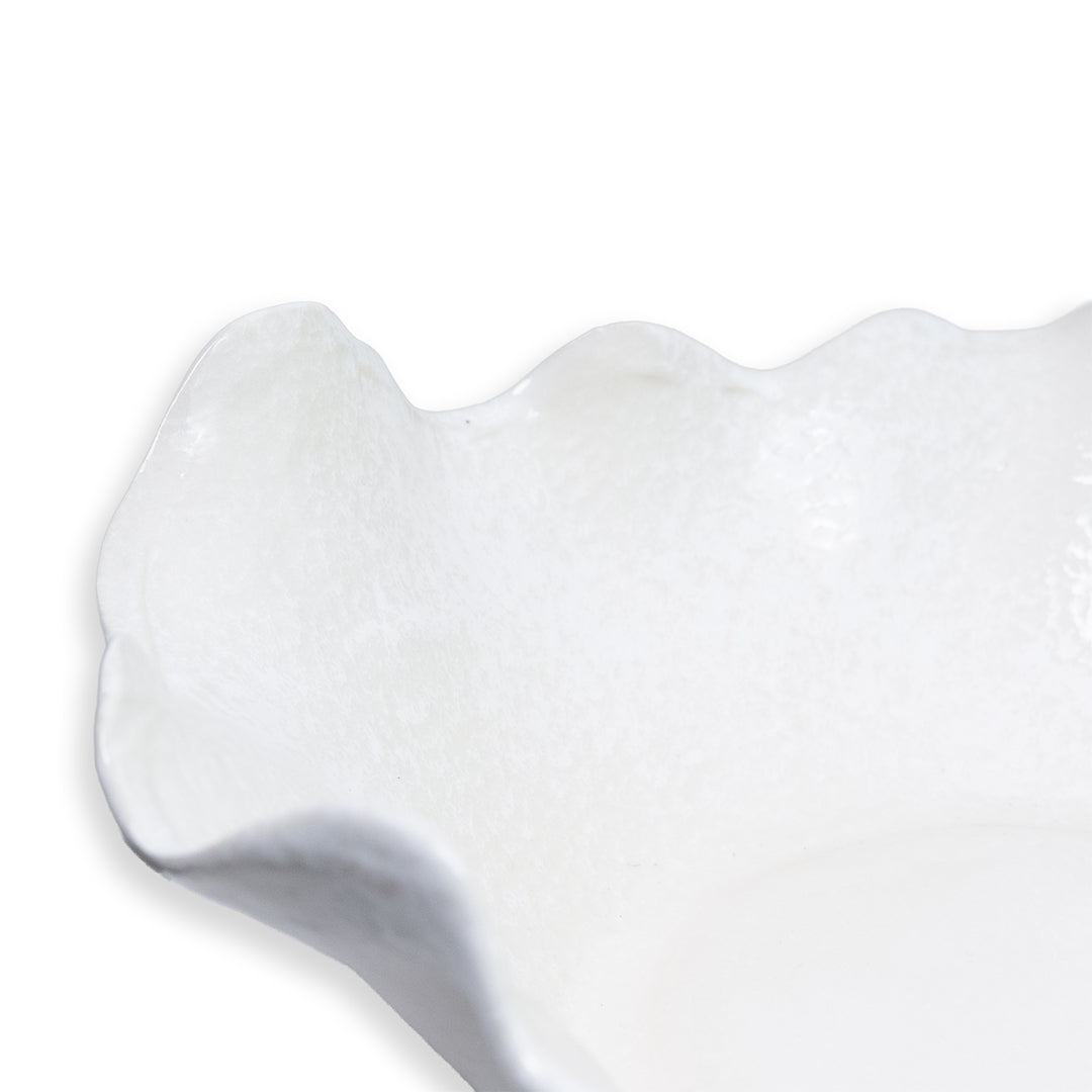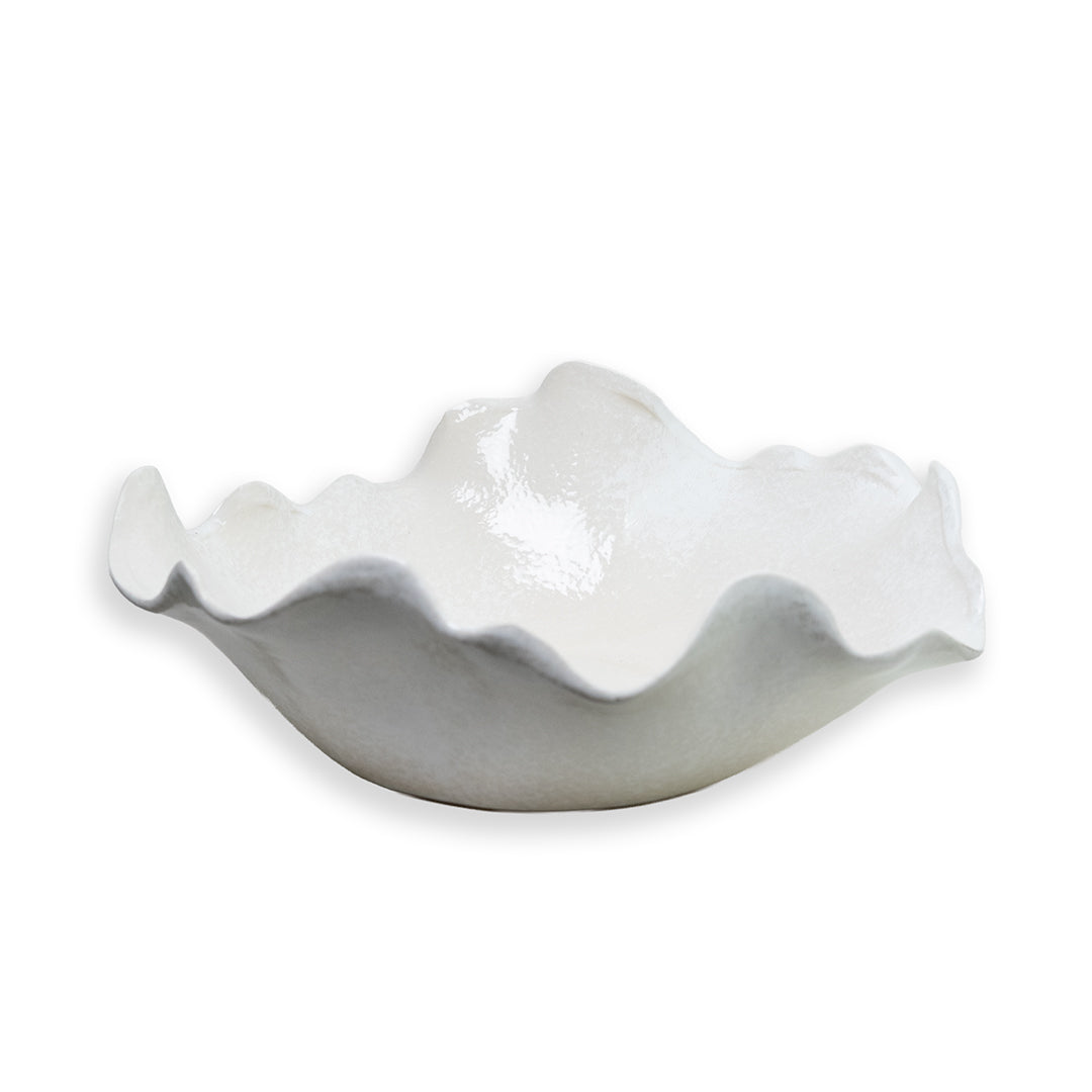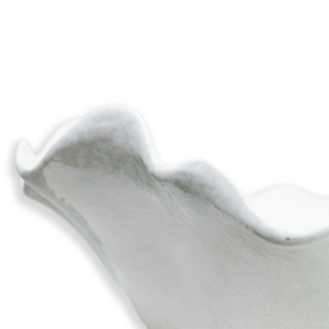 Deze golvende schaal in gebroken wit heeft een zachte, organische vorm en een subtiel glanzend oppervlak. Met een breedte en diepte van 35 cm en een hoogte van 15 cm is het een royaal formaat dat direct rust brengt op tafel of dressoir. De onregelmatige rand geeft de schaal een natuurlijke uitstraling en maakt elk exemplaar net even anders.