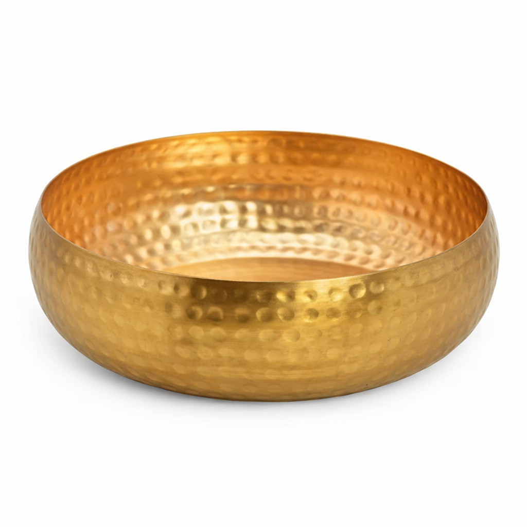 Deze goudkleurige schaal met textuur heeft een ronde vorm en een duidelijk voelbare, gehamerde afwerking. Met een diameter van 35 cm en een hoogte van 10 cm is het een ruim formaat dat praktisch is in gebruik en tegelijk rustig oogt. De warme goudtint en het reliëf geven de schaal een subtiele glans zonder dat hij overheerst.