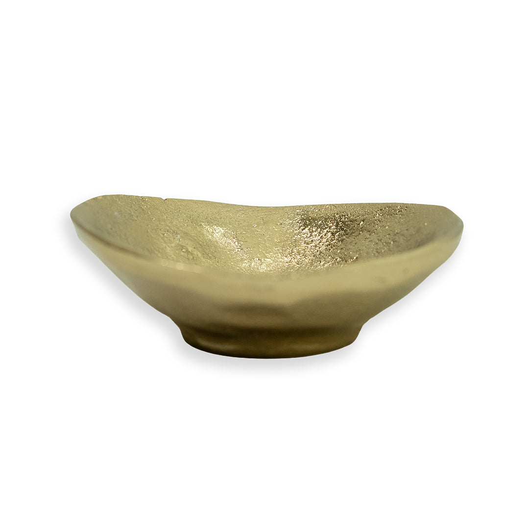 Dit kleine goudkleurige schaaltje heeft een ronde vorm met een licht onregelmatig oppervlak en een zachte glans. Met een breedte van circa 8,5 cm, een diepte van 8 cm en een hoogte van 3 cm is het een compact formaat dat makkelijk een plekje vindt op tafel, het aanrecht of een bijzettafel.