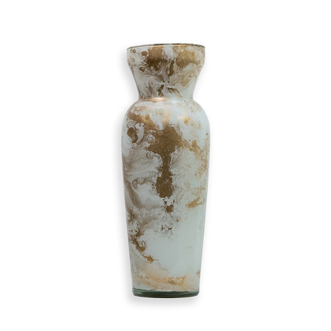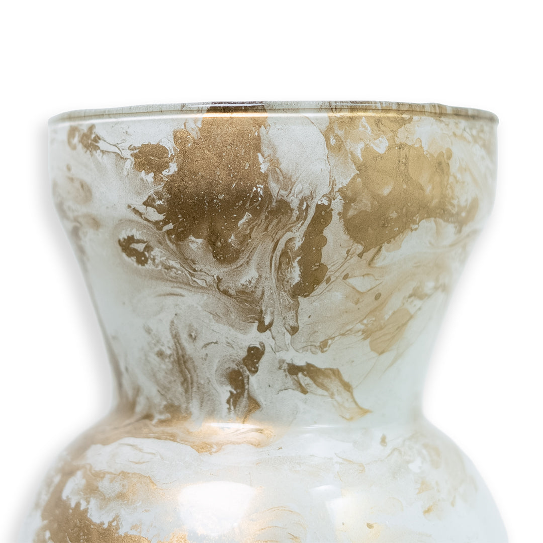 Vaas Marmer wit/goud is een glazen vaas met een rustige witte basis en een subtiel goudkleurig marmerpatroon. De afwerking is licht glanzend en geeft de vaas een warme, stijlvolle uitstraling zonder opdringerig te zijn.